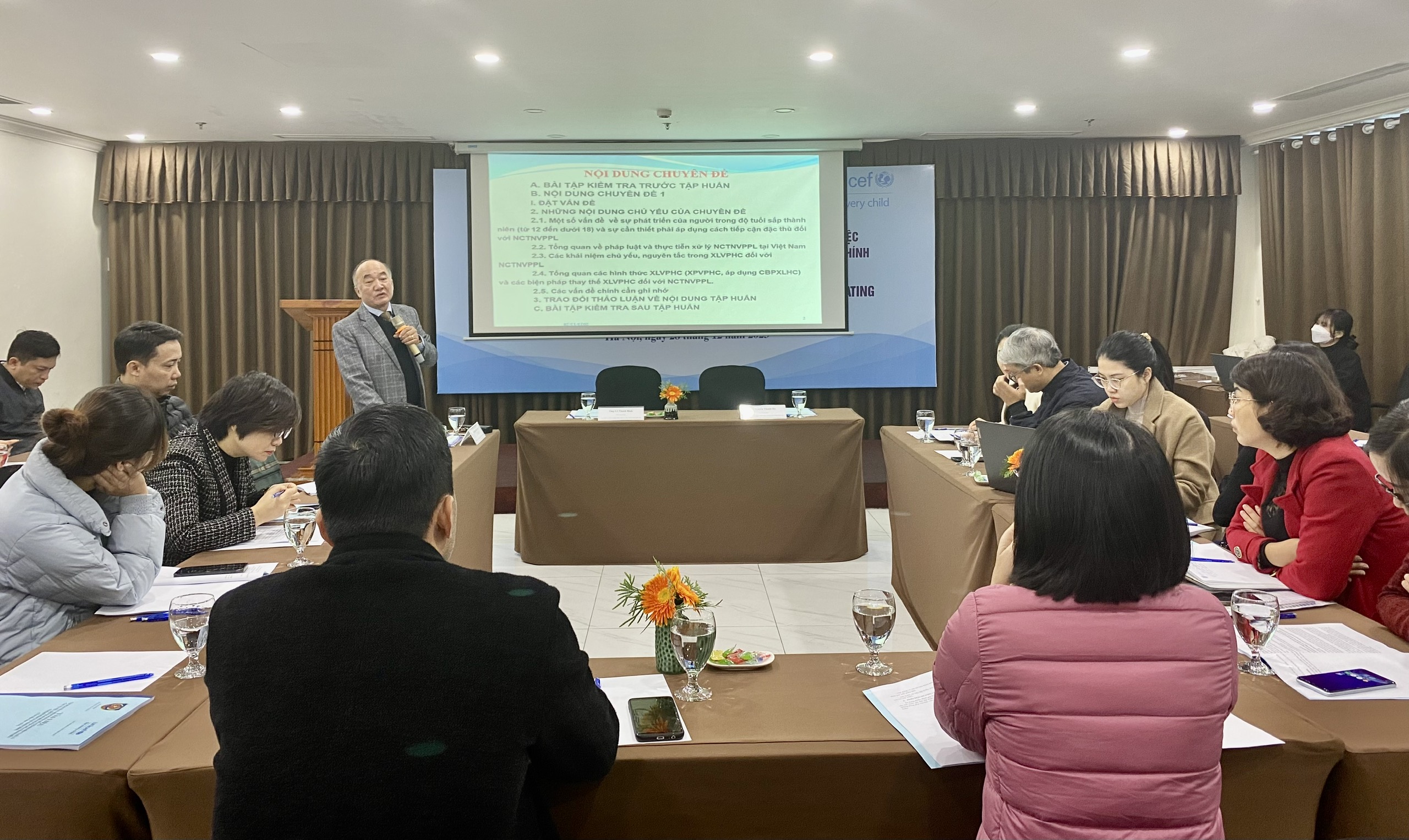 Trong khuôn khổ hoạt động Dự án “Tăng cường tiếp cận tư pháp và bảo vệ người chưa thành niên có liên quan đến pháp luật”, ngày 28/12/2023, tại thành phố Hà Nội, Bộ Tư pháp phối hợp với Quỹ Nhi đồng Liên Hợp Quốc (UNICEF) tại Việt Nam tổ chức Hội nghị “Tập huấn về tư pháp người chưa thành niên và xử lý các vụ việc liên quan đến người chưa thành niên vi phạm pháp luật hành chính”. Hội nghị được tổ chức dưới sự chủ trì của bà Nguyễn Thanh Hà – Phó Cục trưởng Cục Quản lý xử lý vi phạm hành chính và theo dõi thi hành pháp luật, Bộ Tư pháp (Cục QLXLVPHC&TDTHPL) và ông Lê Thanh Bình – Phó Cục trưởng Cục QLXLVPHC&TDTHPL, Bộ Tư pháp. Tham dự Hội nghị có các chuyên gia, giảng viên pháp luật về xử lý vi phạm hành chính đối với người chưa thành niên; đại diện Bộ Công an, Bộ Y tế, Bộ Lao động, Thương binh và Xã hội; đại diện Sở Tư pháp một số tỉnh, thành phố trực thuộc Trung ương và một số cơ quan, đơn vị đóng trên địa bàn thành phố Hà Nội.