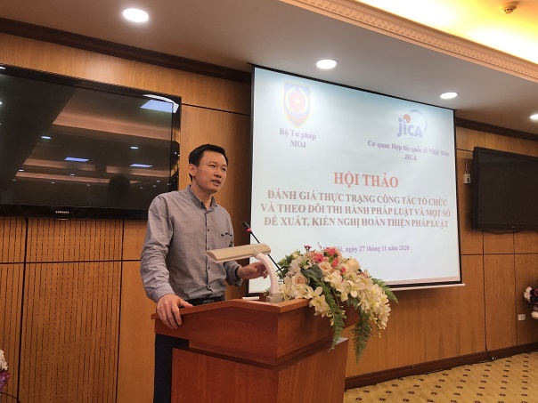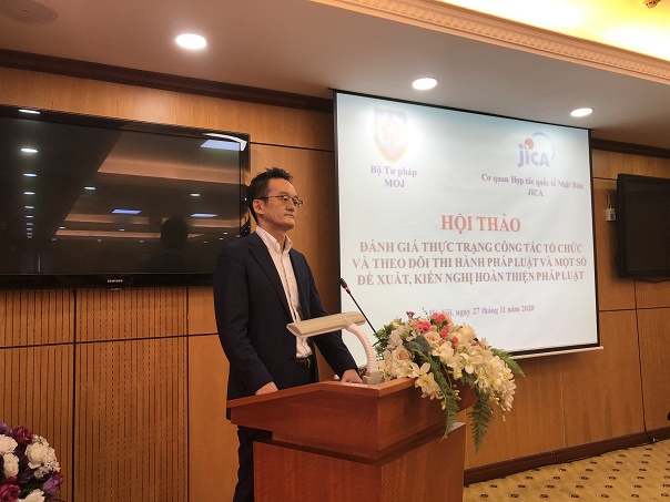 Sáng 27/11, Bộ Tư pháp và Dự án JICA đã phối hợp tổ chức Tọa đàm “Đánh giá thực trạng công tác tổ chức thi hành pháp luật và một số đề xuất, kiến nghị hoàn thiện pháp luật”. Ông Đặng Thanh Sơn, Cục trưởng Cục Quản lý xử lý vi phạm hành chính và theo dõi thi hành pháp luật, Bộ Tư pháp và ông Yokomaku Kosuke, Cố vấn trưởng, chuyên gia Dự án JICA đồng chủ trì Tọa đàm.