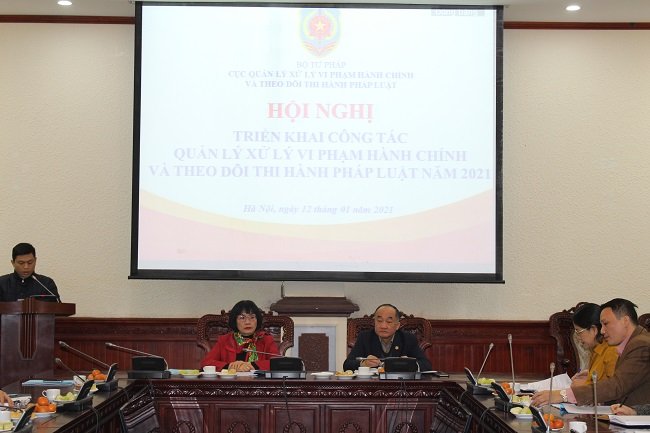 Sáng nay (12/01), Cục Quản lý xử lý vi phạm hành chính và theo dõi thi hành pháp luật (Cục QLXLVPHC&TDTHPL) đã tổ chức Hội nghị triển khai công tác năm 2021. Thứ trưởng Bộ Tư pháp Đặng Hoàng Oanh đã đến dự và phát biểu chỉ đạo Hội nghị. Cùng dự có đại diện lãnh đạo một số đơn vị thuộc Bộ: Vụ Các vấn đề chung về xây dựng pháp luật, Vụ Pháp luật hình sự - hành chính, Cục Kiểm tra văn bản quy phạm pháp luật, Vụ Tổ chức cán bộ,Thanh tra Bộ, Văn phòng Bộ… và các công chức, viên chức của Cục Quản lý XLVPHC và TDTHPL.