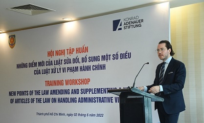 Được sự ủy quyền của Lãnh đạo Bộ Tư pháp, Ông Đặng Thanh Sơn, Cục trưởng Cục Quản lý xử lý vi phạm hành chính và theo dõi thi hành pháp luật (Cục QLXLVPHC&TDTHPL) cùng Ông Florian Feyerabend, Trưởng Đại diện Viện KAS tại Việt Nam và bà Nguyễn Thị Minh Phương, Phó Cục trưởng Cục QLXLVPHC&TDTHPL đồng chủ trì Hội nghị.