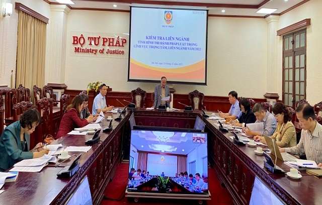Tiếp đó, sáng ngày 25/11/2022, Đoàn kiểm tra liên ngành đã làm việc với UBND tỉnh Kiên Giang. Được sự ủy quyền của Lãnh đạo UBND tỉnh, ông Trần Văn Khái – Giám đốc Sở Tư pháp tỉnh Kiên Giang đã chủ trì, điều hành điểm cầu Kiên Giang cùng đại diện các Sở, ban, ngành và UBND cấp quận, huyện trên địa bàn tỉnh. Trong quá trình làm việc, Đoàn kiểm tra liên ngành đã đề nghị tỉnh Kiên Giang báo cáo, cung cấp thông tin, giải trình về một số nội dung liên quan đến việc kết quả, tình hình thực hiện các lĩnh vực trọng tâm liên ngành năm 2002 theo Quyết định của Thủ tướng Chính phủ; cung cấp thông tin về việc giải quyết phản ánh, kiến nghị của cơ quan nhà nước, người có thẩm quyền, tình hình tuân thủ pháp luật của người dân, doanh nghiệp trong các lĩnh vực trọng tâm, liên ngành năm 2022 trên địa bàn tỉnh; làm rõ thông tin về việc công bố danh mục và thực hiện cắm mốc giới hành lang bảo vệ nguồn nước trên địa bàn tỉnh;….Đại diện các cơ quan, ban ngành hữu quan tại địa phương tham dự buổi làm việc đã lần lượt phát biểu về những những vấn đề đặt ra theo yêu cầu của Đoàn kiểm tra.