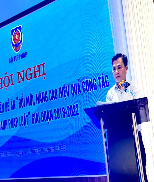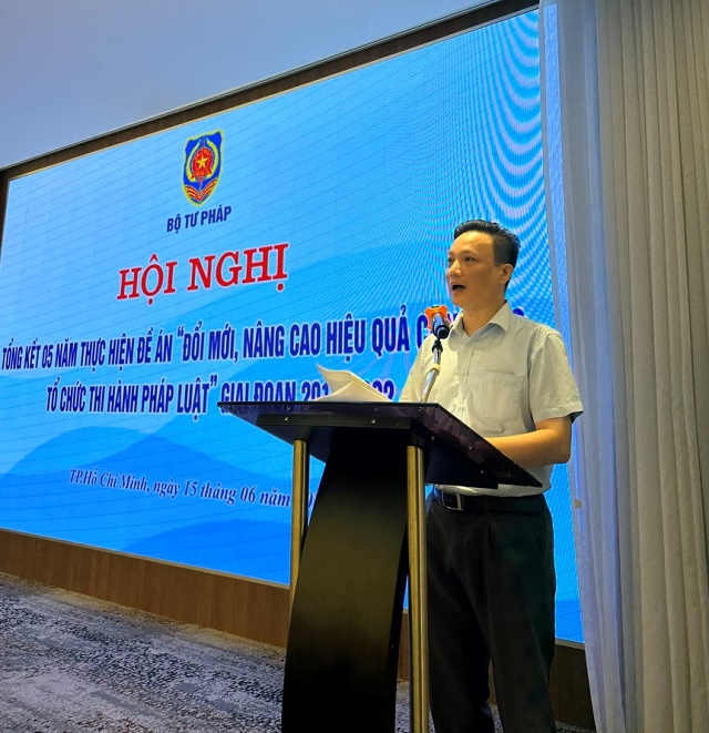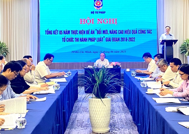 Thực hiện Quyết định số 430/QĐ-BTP ngày 22/3/2023 của Bộ trưởng Bộ Tư pháp ban hành Kế hoạch tổng kết 05 năm thực hiện Đề án “Đổi mới, nâng cao hiệu quả công tác tổ chức thi hành pháp luật” giai đoạn 2018-2022 ban hành kèm theo Quyết định số 242/QĐ-TTg ngày 26/2/2018 của Thủ tướng Chính phủ, Bộ Tư pháp đã tổ chức Hội nghị tổng kết 05 năm thực hiện Đề án “Đổi mới, nâng cao hiệu quả công tác tổ chức thi hành pháp luật” giai đoạn 2018-2022 tại 02 miền (tại TP. Hà Nội ngày 08/6/2023, tại TP. Hồ Chí Minh ngày 15/6/2023).