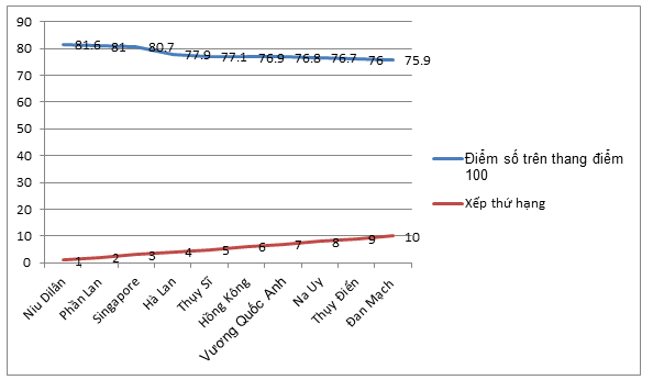 Bảng 1: 10 quốc gia có điểm số và thứ hạng trụ cột thể chế cao nhất năm 2018
